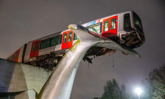 5、轻轨冲出轨道被鲸鱼雕像接住 2日凌晨,荷兰斯派克尼瑟的一辆轻轨冲出了轨道末端缓冲带,结果被一座鲸鱼艺术雕塑给接住了,保险杠被撞倒,火车悬挂在离地面约8米的地方,看起来像被放在鲸鱼尾鳍的艺术品上。事故发生期间,地铁没有载客,无人员伤亡。网友:有鲸无险!(@观察者网)