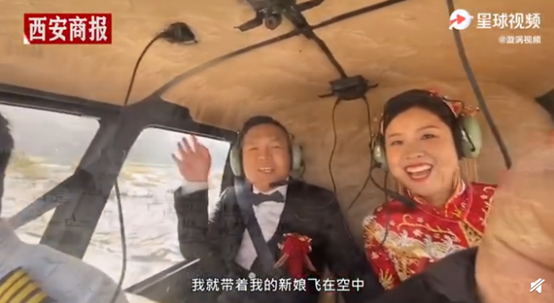 3、男子花1197元坐直升机接新娘 1日,陕西延安的赵先生结婚花费1197元用直升机接新娘,只为感受壶口瀑布的壮观。赵先生介绍,因为从小在黄河边长大,对黄河有特别的热爱,所以在自己结婚的时候就想到了唢呐和黄河。据悉,婚礼现场的唢呐演奏者,曾在30年前为他父母的婚礼演奏过乐曲。(@新华网)