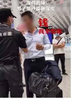 3、机场用人民币砸保安男子被行拘 深圳一男子在机场发飙,用人民币砸执勤人员。警方通报,因航班受台风影响取消,男子酒后前往售票柜台辱骂工作人员,推搡劝阻的执勤人员,并掏出现金扔向执勤人员。男子因扰乱公共场所秩序被行政拘留5日。(@梨视频)